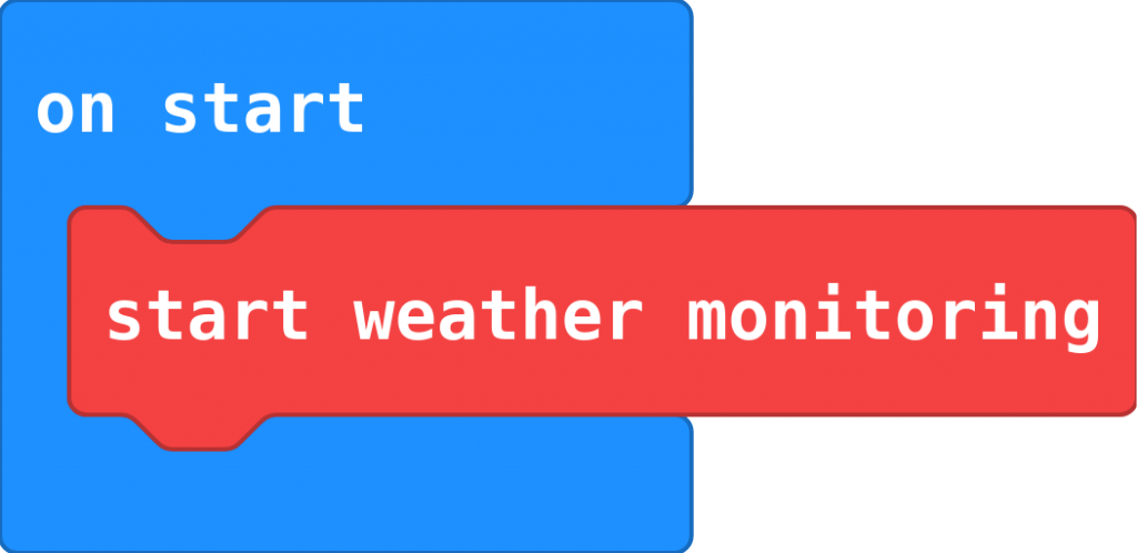 W grupie Weather są aż trzy bloki inicjalizujące. Ich użycie jest zależne od potrzeby obserwacji danej wielkości lub od posiadanych czujników. W naszym przykładzie użyjemy jedynie bloku Weather/start weather monitoring, który powinien znaleźć się w bloku on start.
