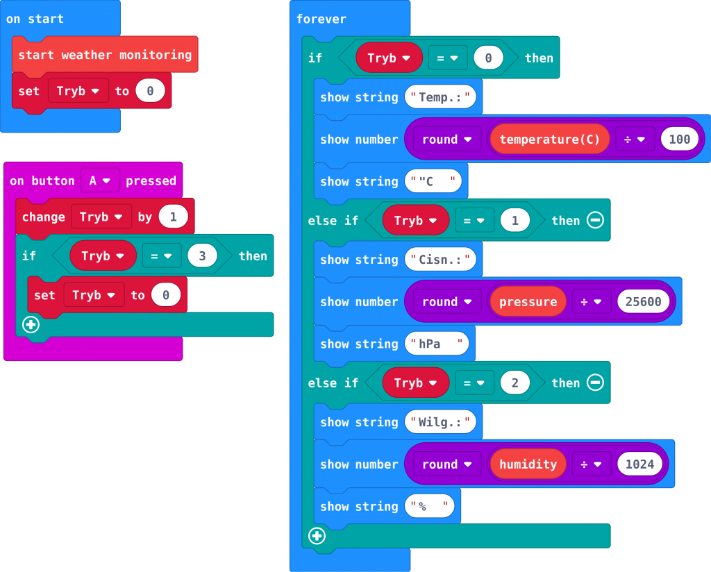 Tak napisany program jest wystarczający do prezentacji wykorzystania modułu weather:bit w połączeniu z micro:bit, ale jeżeli interesuje nas konkretna wielkość, to będziemy musieli czekać na przewinięcie ekranu, aż do jej pojawienia się. Zmodyfikujemy nasz program, wprowadzając tryb, decydujący o tym, która wielkość będzie w danej chwili wyświetlana. W tym celu zadeklarujemy zmienną Tryb i będziemy ją inkrementować po każdym naciśnięciu przycisku A. Zmienna ta w bloku forever decydować będzie o wyborze mierzonej wielkości. Przy okazji usunięto z listy wysokość, aby skrócić kod. Gotowy program jest widoczny na listingu 3.