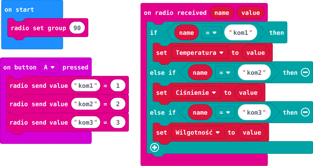 Na listingu 4 zamieszczono przykład dwustronnej komunikacji wykorzystującej klucz (name, value). Jedno przyciśnięcie przycisku A powoduje trzykrotne uruchomienie na drugim urządzeniu bloku on radio received, nadając w każdym przebiegu zmiennej (zgodnie z komunikatem) odpowiadającej jej wartości. Wartości 1, 2 i 3 nadane temperaturze, ciśnieniu i wilgotności są przykładowe i zostaną podmienione w kodzie pracującym na stacji bazowej na zmierzone wartości.