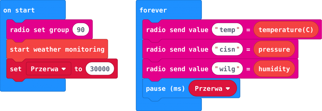 W takim przypadku program działający na nadajniku z podłączonym modułem weather:bit jest bardzo krótki (listing 5). Można zobaczyć, że czas pomiędzy nadawaniem wszystkich trzech wartości jest określony w milisekundach zmienną Przerwa i wynosi w przykładzie 5 pół minuty, ale z powodzeniem może być dłuższy.