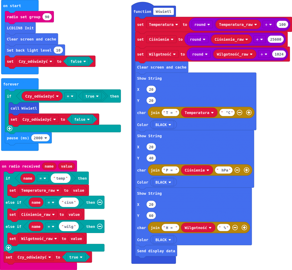 Gdy warunek Czy_odświeżyć zachodzi, wówczas wywoływana jest funkcja Wyświetl. W niej następuje przeliczenie wartości i ich wyprowadzenie na ekran. Jej głównym zadaniem jest podzielenie kodu na mniejsze fragmenty w celu poprawy czytelności. W programie zastosowano także, co jest nieco nadmiarowe, dwie grupy zmiennych: Temperatura, Ciśnienie i Wilgotność oraz ich odpowiedniki przechowujące surowe dane z czujników Temperatura_raw, Ciśnienie_raw i Wilgotność_raw. Przeliczenie jednych wielkości na drugie też następuje w funkcji Wyświetl.